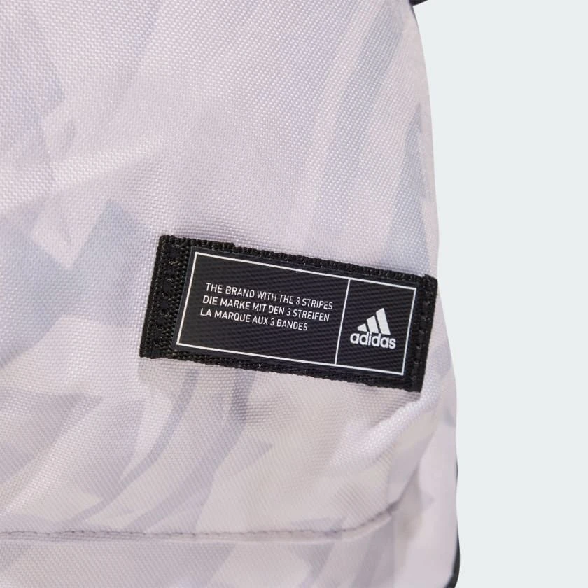 A classic pack with an edgy look. This adidas backpack lends fresh attitude to your casual outfits thanks to a cool allover print. Roomy enough for all your essential gear, it has a zip main compartment, front zip pocket and side slip-in pockets to keep everything organised. Padded adjustable straps add comfort if the bag gets heavy. This product is made with at least 50% recycled materials. By reusing materials that have already been created, we help to reduce waste and our reliance on finite resources and reduce the footprint of the products we make.
