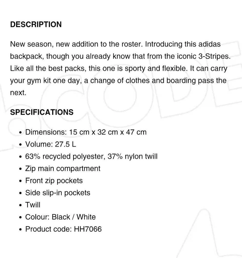 New season, new addition to the roster. Introducing this adidas backpack, though you already know that from the iconic 3-Stripes. Like all the best packs, this one is sporty and flexible. It can carry your gym kit one day, a change of clothes and boarding pass the next. Made in part with recycled content generated from production waste, eg. cutting scraps, and post-consumer household waste to avoid the larger environmental impact of producing virgin content.